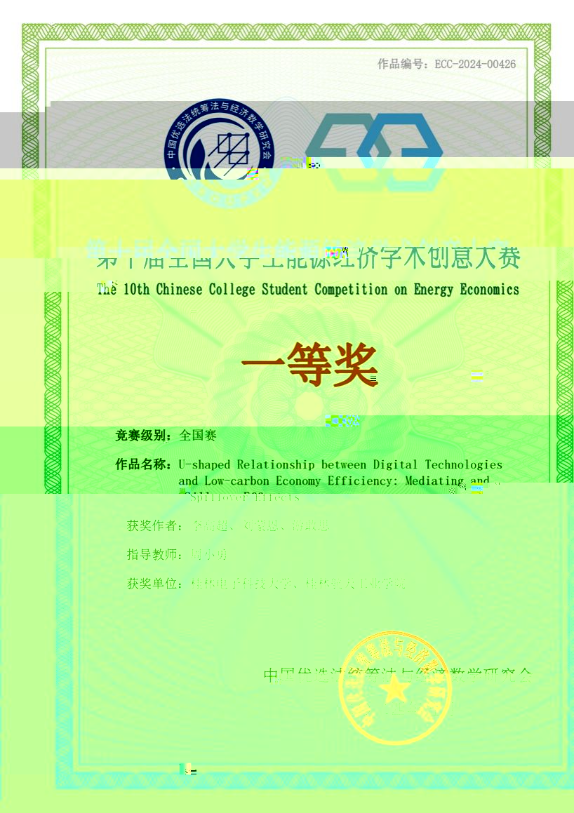 近日,第十屆全國大學生能源經濟學術創意大賽在中國地質大學(北京)圓滿落幕。由我校數智碳中和創新團隊帶頭人周小勇教授指導的研究生團隊經過校賽、區域賽和國賽的激烈角逐,參賽作品“U-shaped Relationship between Digital Technologies and Low-carbon Economy Efficiency: Mediating and Spillover Effects”(團隊隊長:李高超;指導老師:周小勇)榮獲研究生組國賽一等獎,周小勇教授獲評優秀指導教師獎。此次獲獎實現了我校在該項賽事的重大突破,也标志着我校在聯合培養研究生和指導研究生參與學術競賽方面邁上了更高的台階。